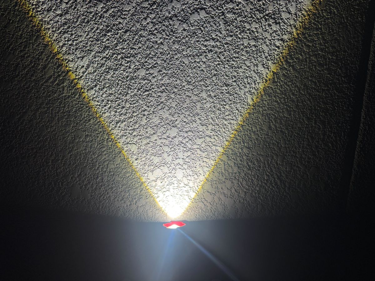 The focus can be adjusted by sliding the lens bell forward. It’s a bit stiff the first time, it takes a little extra to pull it forward, but then it adjusts easily. It doesn’t have a pin-point focus. Adjusting the lens can reduce the angle slightly, but the wide/flood style beam is where this light really…shines.