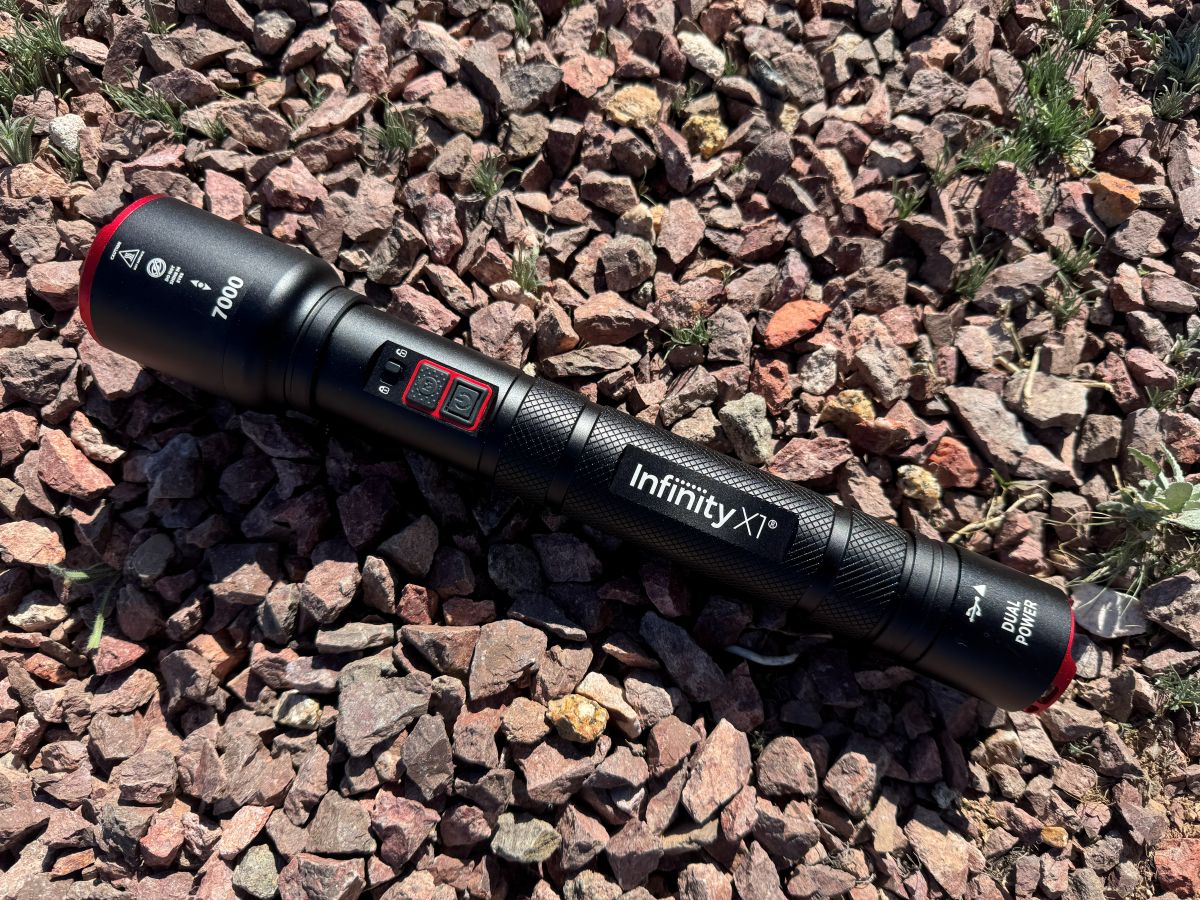 Infinity X1 7,000‑lumen Dual Power Rechargeable Flashlight emphasizes brightness, durability, and a hybrid power system. It measures 12.4 inches long and weighs 1.5 pounds.