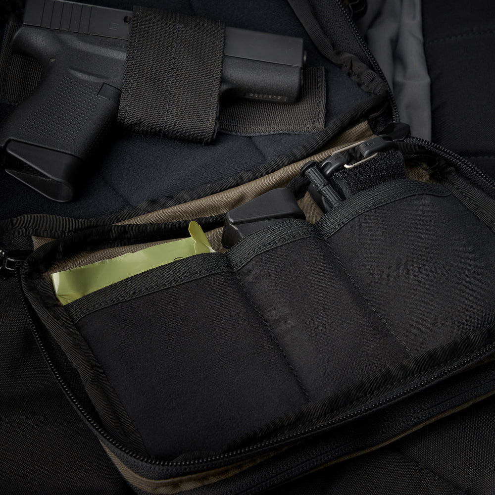 The QRF Pack features a dedicated concealed-carry compartment designed for quick, secure access, accommodating most compact and subcompact handguns. An internal Rapid Deployment Panel provides elasticized organization for magazines, tourniquets and medical supplies, ensuring immediate access under stress. Complementing these tactical elements, the front pocket and secondary zippered compartment offer organized storage for keys, phones, wallets, and other daily necessities while maintaining a discreet separation between personal items and CCW gear.