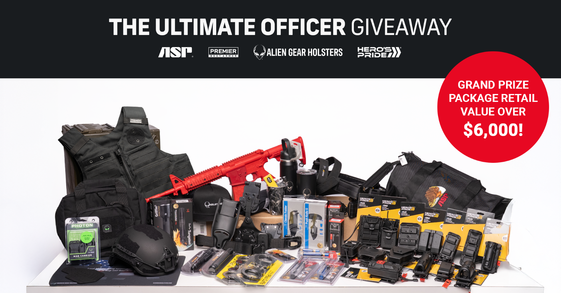 Appleton, WI, April 13, 2026 — Law Enforcement equipment manufacturers Armament Systems and Procedures (ASP), Alien Gear Holsters, Hero’s Pride and Premier Body Armor have joined forces to put together a unique new prize drawing that any police officer or security professional would love to win. The grand prize in the Ultimate Officer Giveaway includes more than fifty individual items—from handcuffs to flashlights, holsters to belts and duty gear, body armor and much more—with a total retail value of over $6000.